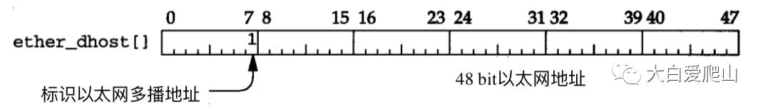 bcmp比较etherbroadcastaddr和ether_dhost,如果相同,则设置标志M_BCAST。一个以太网多播地址由这个地址的首字节的低位比特来标识,如图6所示。 图6 检验一个以太网多播地址