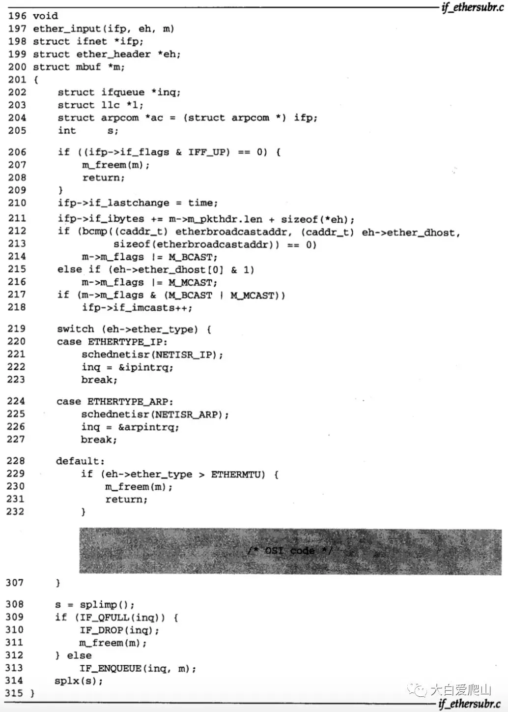 219~227 ether_input根据以太网类型字段来跳转。对于一个IP分组,schednetisr调度一个IP软件中断,并选择IP输入列队,ipintrq。对于一个ARP分组,调度ARP软件中断,并选择arpintrq。一个isr是一个中断服务例程。
