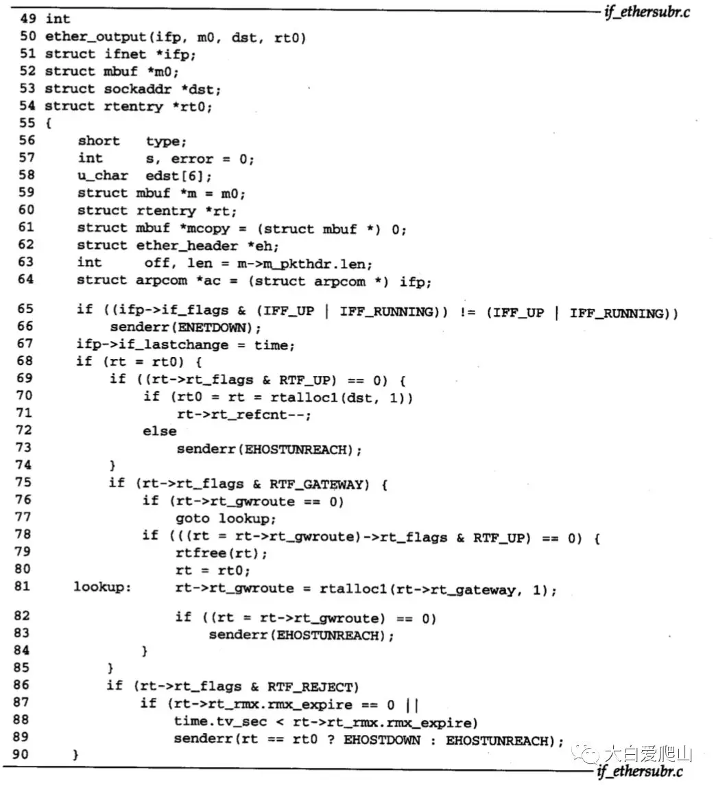 49~64 ether_output的参数有:ifp,它指向输出接口的ifnet结构;m0,要发送的分组;dst,分组的目标地址;rt0,路由信息。