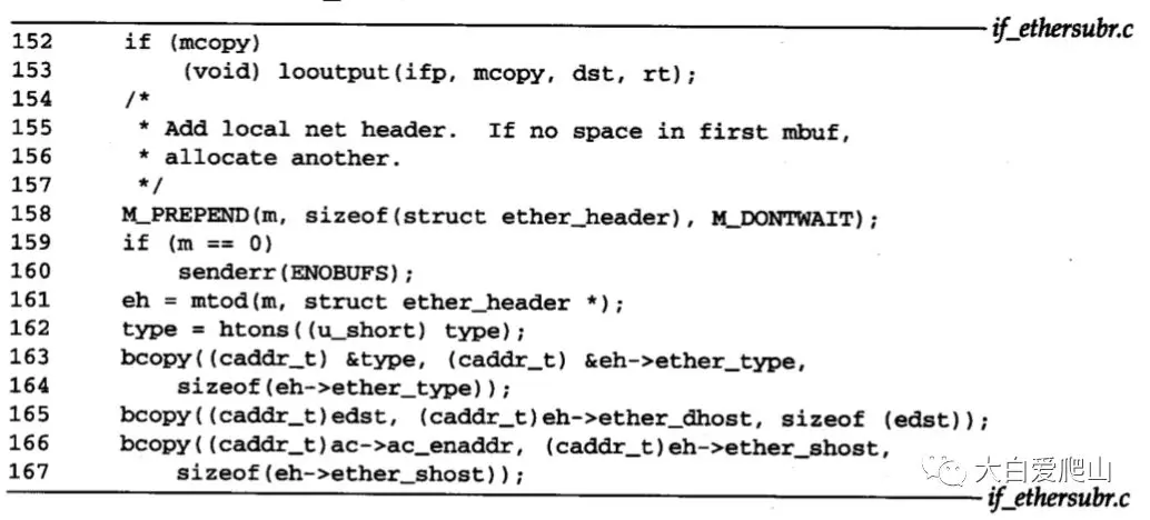 147~151 未识别的地址族类产生一个控制台消息,并且返回EAFNOSUPPORT。图12所示的是ether_output的下一部分:构造以太网帧。 图12 函数ether_output:构造以太网
