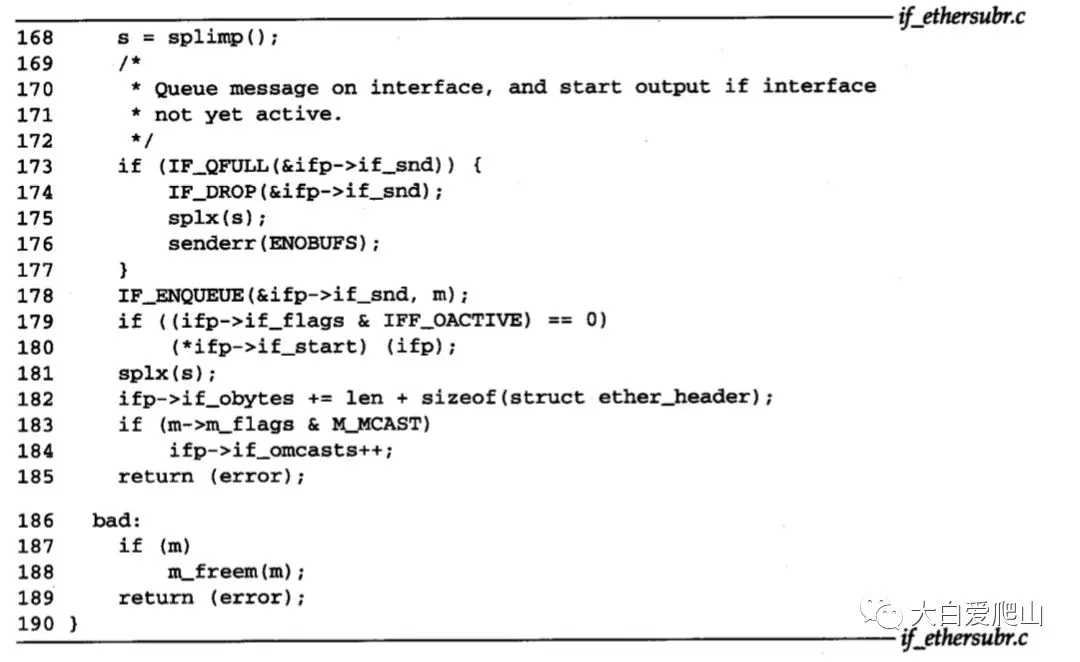 168~185 如果输出队列已满,ether_output丢弃此帧,并返回ENOBUFS。否则将这个帧放置到接口的发送队列中,并且若接口未激活,接口的if_start函数开始传输帧。