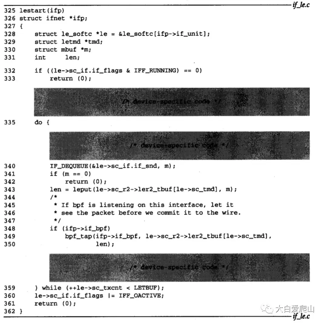 343~350 leput将m中的帧复制到leput第一个参数所指向的硬件缓存中。如果接口带有BPF,将帧传给bpf_tap。关于硬件缓存中帧传输的设备专用初始化代码不予讨论。