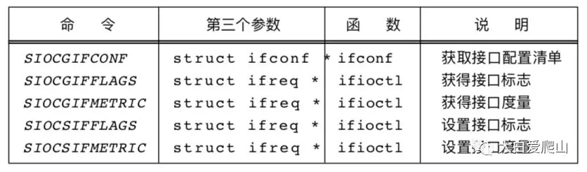 fd是一个描述符,通常是一个设备或者网络连接。每种类型的描述符都支持它自己的一套ioctl命令,这套命令由第二个参数com来指定。第三个参数在原型中显示为“...”,因为它是依赖于被调用的ioctl命令的类型的指针。如果命令要取回信息,第三个参数必须是指向一个足够保存数据的缓存的指针。在本文中,我们仅讨论用于插口描述符的ioctl命令,图15列出常用的ioctl命令。