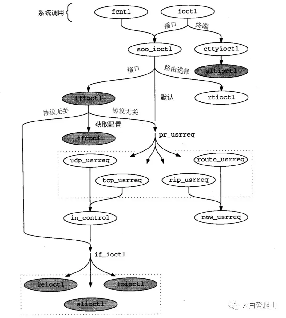 图16显示了处理ioctl命令的各种函数的组织。带阴影的函数我们在本章中说明。