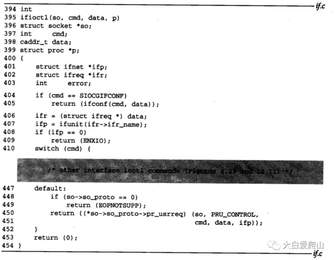 447~454 如果接口ioctl命令不能被识别,ifioctl把命令发送给与所请求插口关联的协议的用户请求函数。如果控制到达switch语句外,返回0。