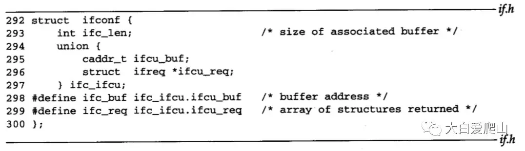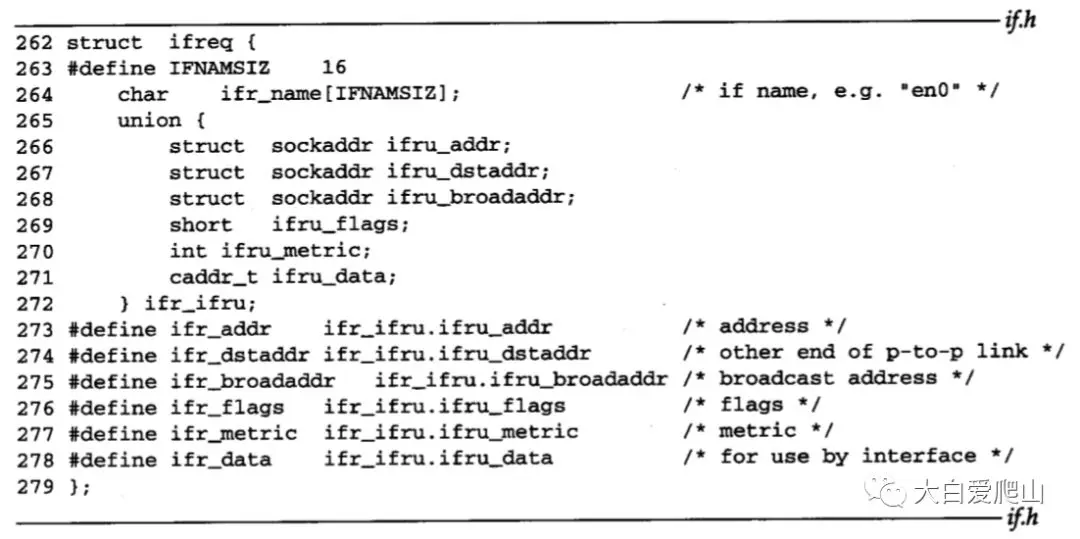 262~279 在ifreq结构中,ifr_name表示接口名称。在union中的其它成员被各种ioctl命令访问。通常,用宏来简化对联合体的成员的访问语法。