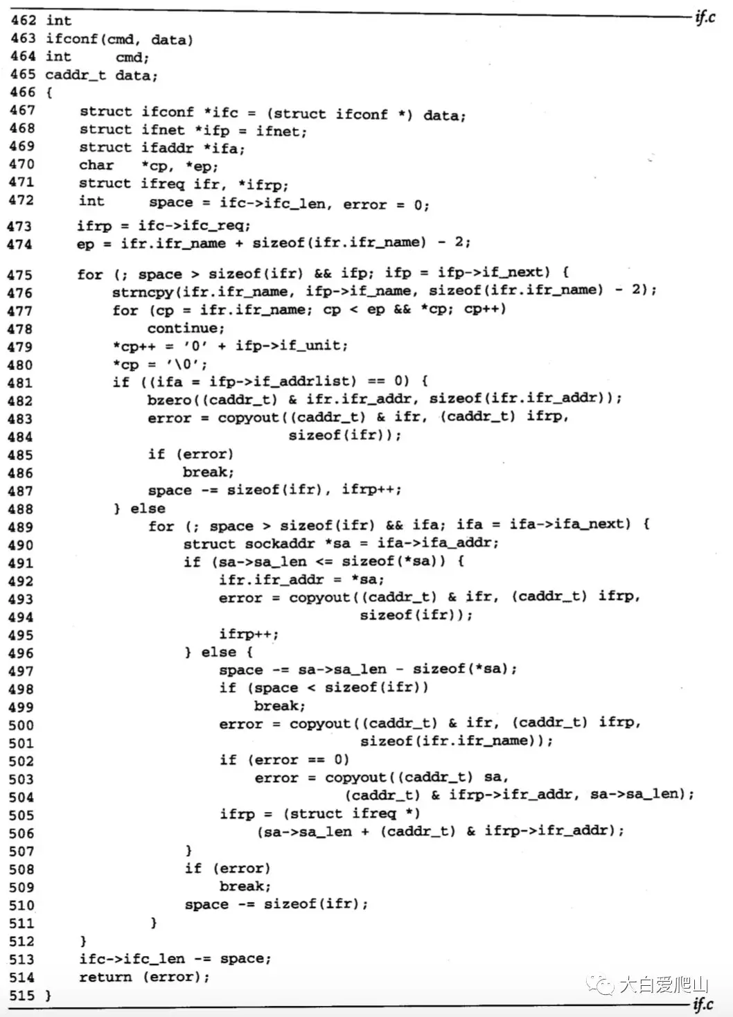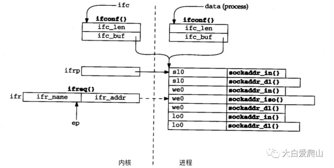 ifc为一个ifconf结构指针,指向data;ifp从ifnet(列表头)开始遍历接口列表,而ifa遍历每个接口的地址列表。cp和ep控制构造在ifr中的接口文本名称,ifr是一个ifreq结构,它在接口名称和地址复制到进程的缓存前保存接口名称和地址。ifrq指向这个缓存,并且在每个地址被复制后指向下一个。space是进程缓存中剩余字节的个数,cp用来搜索名称的结尾,而ep标志接口名称数字部分最后的可能位置。