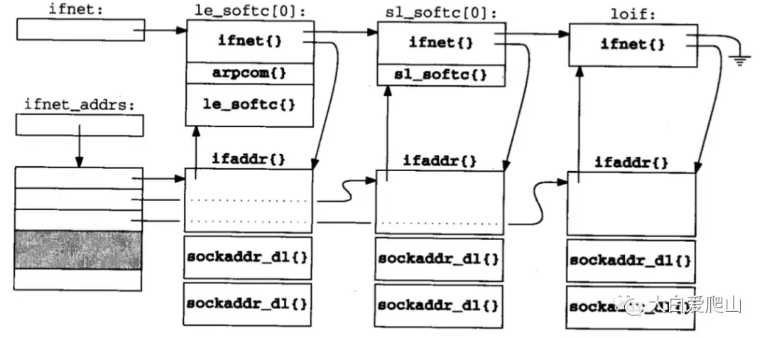 图22显示了以太网、SLIP和环回接口初始化的接口结构的配置。 图22 接口和地址数据结构