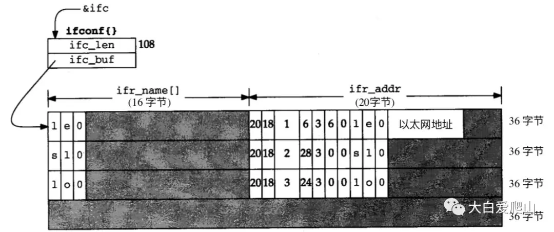 在图22中,因为缓存中返回的三个地址仅占用108(36*3)字节,ioctl将ifc_len由144改为108。返回三个sockaddr_dl地址,并且这个缓存后面的36个字节未用。每项的前16个字节包含接口的文本名称,在这16个字节中只有前3个字节被使用。 图23 SIOCGIFCONF 命令返回后的数据