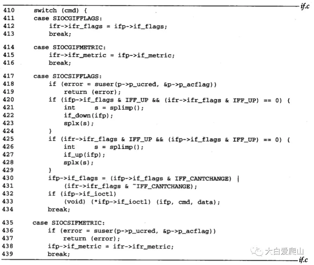 417~429 为改变接口的标志,调用进程必须有超级用户权限。如果进程正在关闭一个运行的接口或者启动一个未运行的接口,分别调用if_down和if_up。
