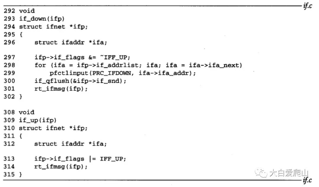 308~315 当一个接口被启用时,IFF_UP标志被设置,并且rt_ifmsg通知路由系统接口状态发生变化。