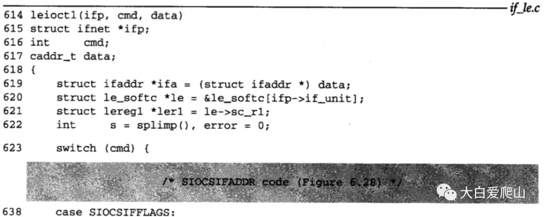 614~623 leioctl把第三个参数data转换为一个ifaddr结构的指针,并保存在ifa中。le指针引用下标为ifp->unit的le_softc结构。基于cmd的switch语句构成了这个函数的主体。