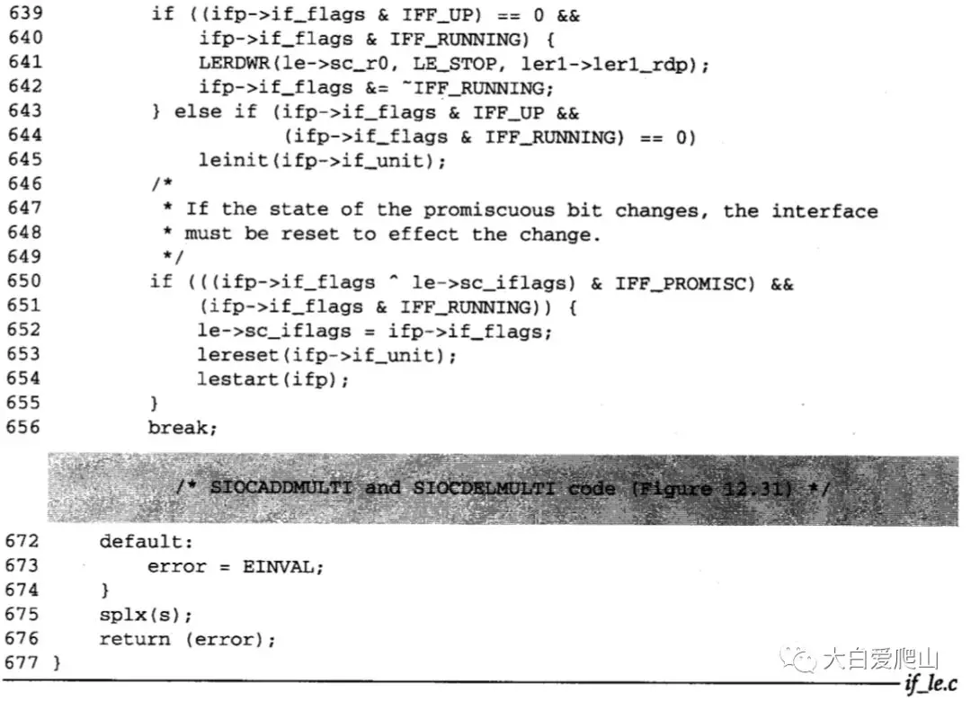 638~656 图26中仅显示了case为SIOCSIFFLAGS的情况。这次ifioctl调用leioctl,接口标志被改变,强制物理接口进入标志所配置的状态。如果要关闭接口,但接口正在工作,则关闭接口。若要启动未操作的接口,接口被初始化并重启。