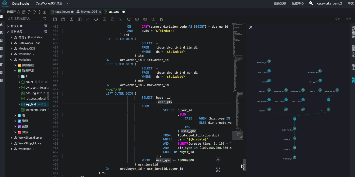 具体来说,该产品提供了任务调度、元数据管理、权限管理、智能运维等能力,可轻松实现结构化、半结构化、无结构化海量数据的集成、加工、挖据,同时也兼具智能运维、数据质控、数据安全的必要能力。用户通过托拉拽的方式即可快速构建数据处理流程,使用智能SQL编辑器编写代码。