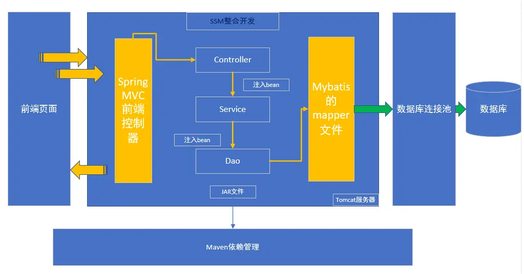 我们将整体的结构分成了五个部分,分别是前端页面、Spring容器、数据库连接池、数据库(这两部分其实可以合成一部分)、Maven依赖管理。 完成一个web请求的个过程大致如下: