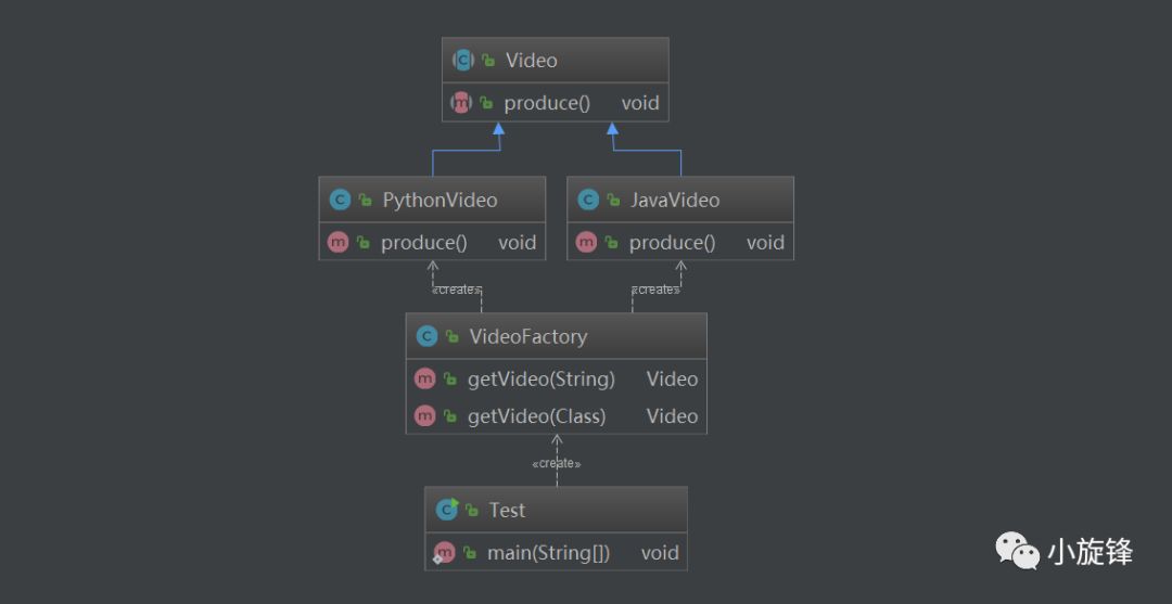 public class Test { public static void main(String[] args) { VideoFactory videoFactory = new VideoFactory(); Video video1 = videoFactory.getVideo("python"); if (video1 == null) { return; } video1.produce(); Video video2 = videoFactory.getVideo(JavaVideo.class); if (video2 == null) { return; } video2.produce(); }}