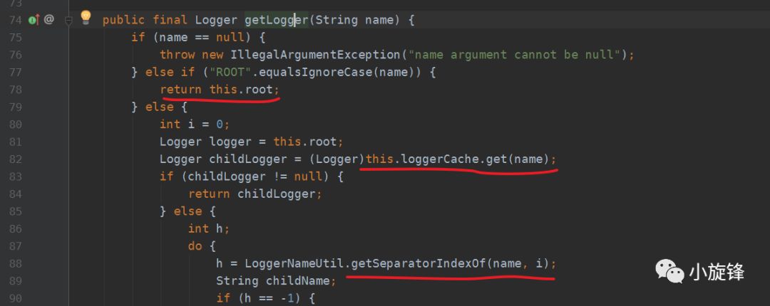 查看 LoggerFactory 类的 getLogger 方法,可看到调用了 iLoggerFactory.getLogger(),其中 iLoggerFactory 是一个接口