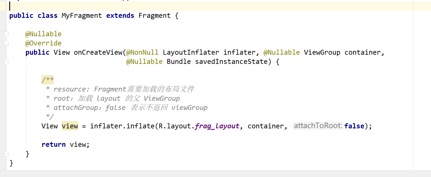 第二:新建一个 MyFragment 类并继承 Fragment,这里引用 v4 下的包,具有兼容性。顺便提一下,正常我们引入包的时候都用 v4 或者 v7 下的包,这里的包都是向下兼容,否则可能会出现意想不到的问题。我们在这里重写 onCreateView()方法,这个方法里通过 LayoutInflate 的 inflate() 方法将刚定义的 frag_layout 布局加载进来并得到一个 View,在 return 这个 view 就 OK。