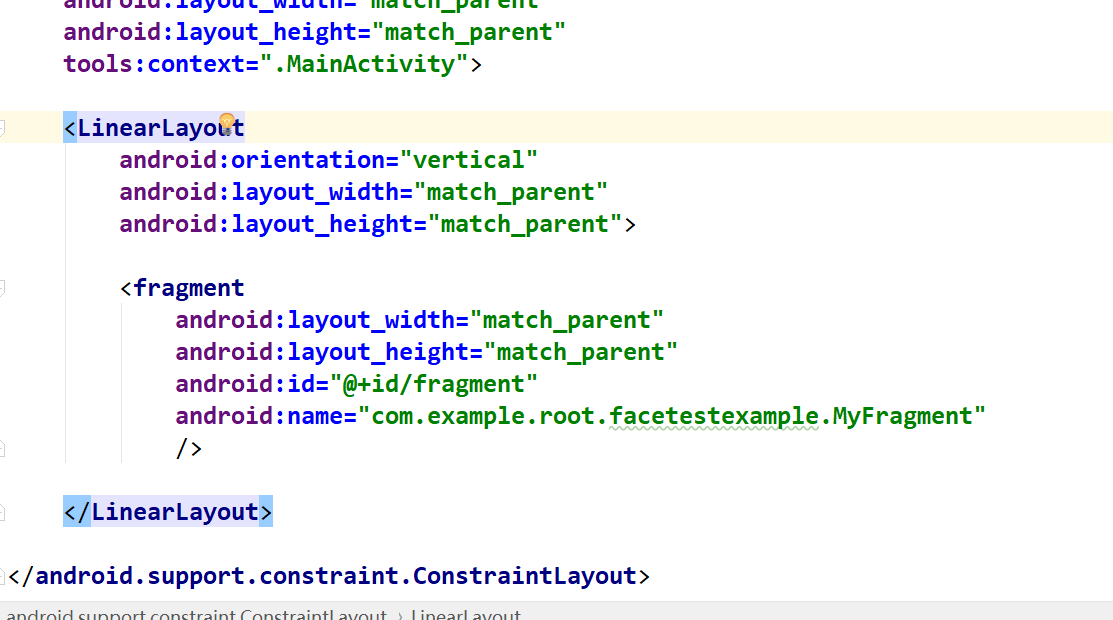 第三:在 main_xml 布局中修改,使用 < fragment > 标签来添加碎片,并且切记切记要加上 android:name 属性。之后会有自动提示,加载的完整形式是 包名.类名