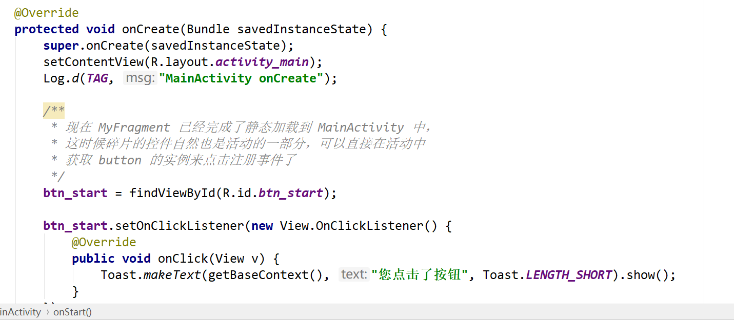 第四步:在 MainActivity 中加载main布局。现在MyFragment就完成了静态加载到 MainActivity 中,这时碎片里的控件自然也是活动的一个部分,可直接在活动中获取到 Button 的实例,来注册点击事件了。