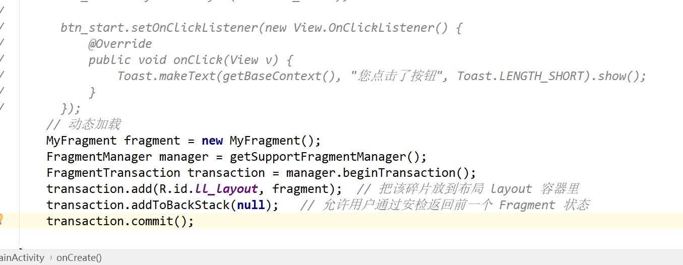 这里注意到动态加载进来的Fragment里的控件并不能直接在活动中findViewById得到,那么如何实现点击效果呢,学完下一个知识点就有办法了。