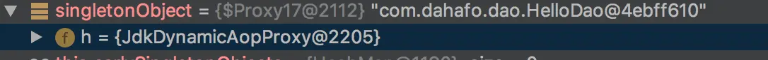 到了DefaultSingletonBeanRegistry#getSingleton(java.lang.String, boolean)方法,我们看第一行Object singletonObject = this.singletonObjects.get(beanName)的this.singletonObjects,是一个 ConcurrentHashMap,它里面保存了很多类,我们可以从里面找到key为helloDao的类,我们往下走一步,可以看到singletonObject有值了