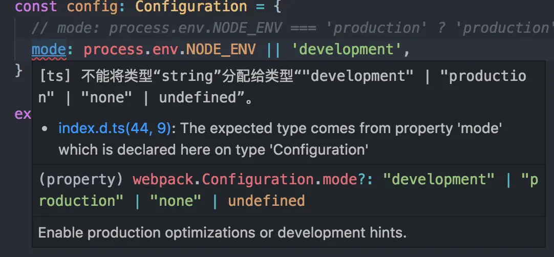 如果注释写得足够完善,基本可以当成文档来用了,而且在VS Code编辑器中还有动态的提示,以及一些错误的纠正,比如上述的NODE_ENV的获取,如果直接写process.env.NODE_ENV || 'development'是会抛出一个异常的,因为从d.ts中可以看到,关于mode只有三个有效值production、developemnt和none,而process.env.NODE_ENV显然只是一个字符串类型的变量。