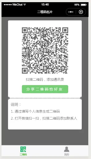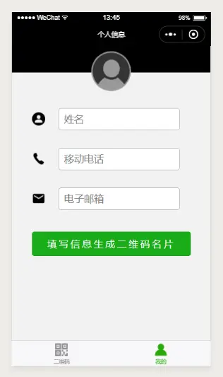 可以看到,这里将小程序分为两个主要的界面,二维码页面负责提供扫描的二维码,个人界面负责由用户自己填写个人信息,这里面包含姓名、移动电话和电子邮箱信息。当用户点击生成二维码名片的按钮时将数据保存在本地并自动跳转到二维码界面。