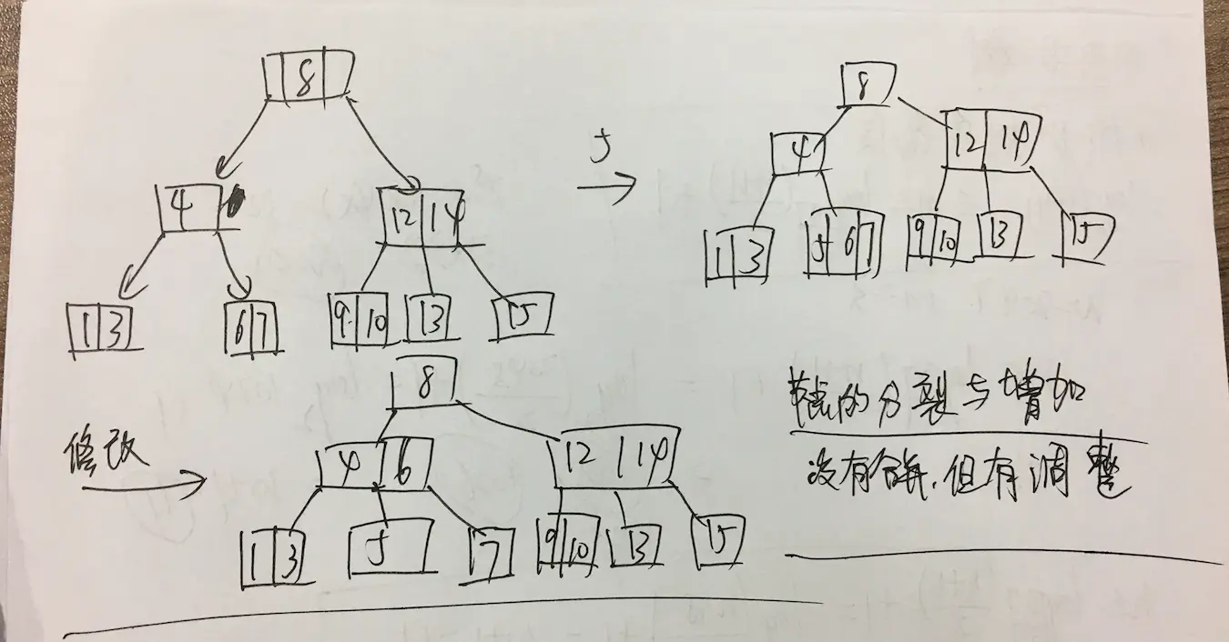 插入一定是在最下层插入,只有当插入节点后,最下层超过了最大节点,才会分裂