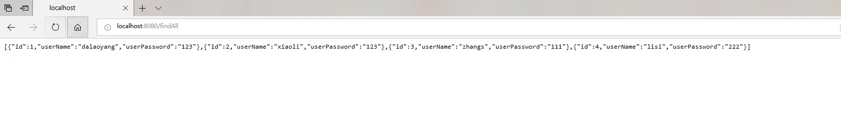 运行项目,浏览器访问localhost:8080/findAll如图所示: