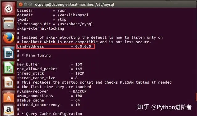 3、为了让外边的其他的IP正常访问到,需要设置bind-address对应的IP为0.0.0.0。使用vi或者vim,编辑my.cnf配置文件,配置完成之后如下图所示。