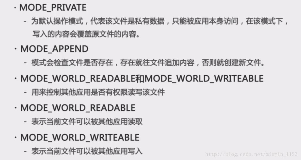 这里说明一下 openFileOutput() 的两个参数,第一个不用多说,是代表文件名。就是把数据存入哪里。第二个是文件的操作模式: