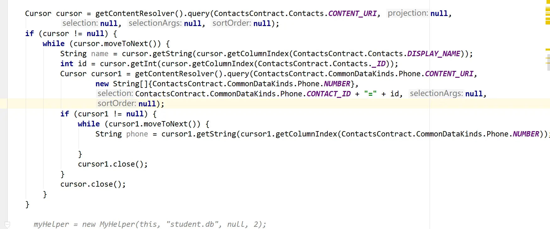 下面我们来看看查询联系人数据的基本代码: