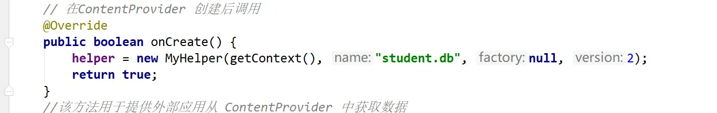 接下来就是六个抽象方法的具体实现了,先看onCreate()方法,这里创建了一个MyHelper的实例,然后返回true表示内容提供器初始化成功,现在数据库就已经完成了创建或升级操作。