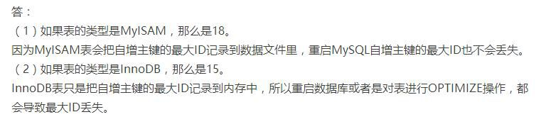 1、一张表,里面有ID自增主键,当insert了17条记录之后,删除了第15,16,17条记录,再把Mysql 重启,再insert一条记录,这条记录的ID是18还是15 ?