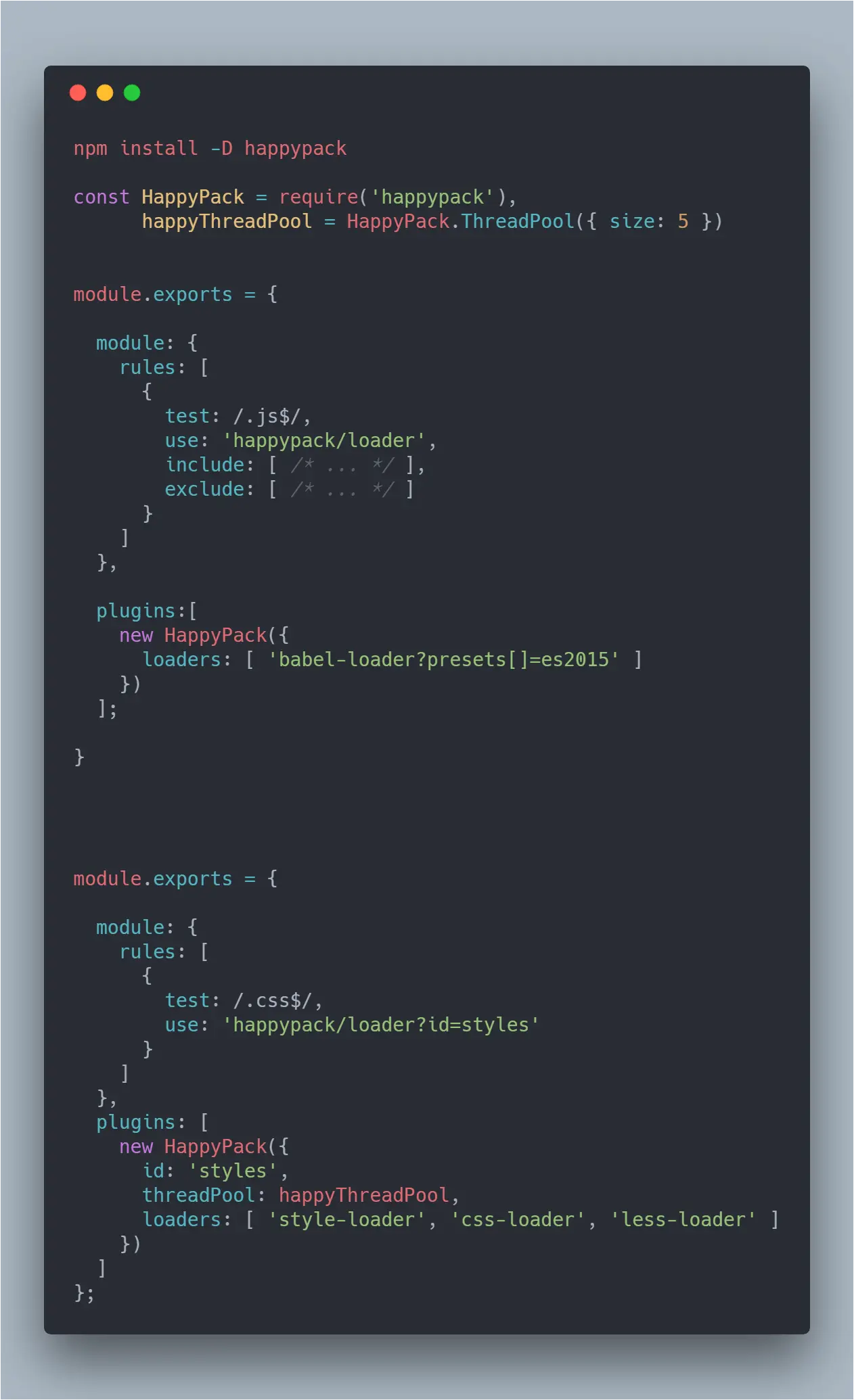 happypack的处理思路是将原有的webpack对loader的执行过程从单一进程的形式扩展多进程模式,原本的流程保持不变,这样可以在不修改原有配置的基础上来完成对编译过程的优化。