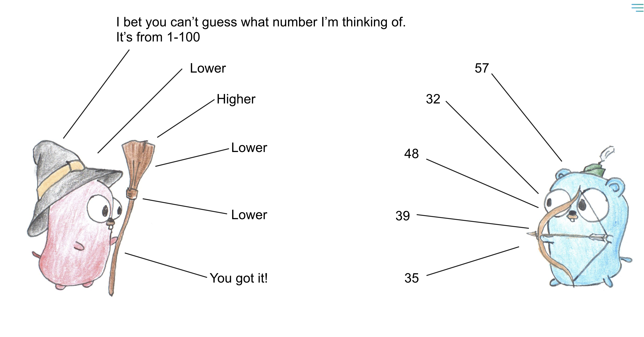 这是一个『猜数游戏』,很多人儿时玩过的游戏。你邀请你的朋友来参加在某个范围内(比如 1 至 100)猜一个特定数的游戏。然后你朋友可能会说『57』。一般情况下第一次猜会猜错,但是你会告诉他们猜测的数字是大了还是小了。然后他可以继续猜测知道最后猜中为止。