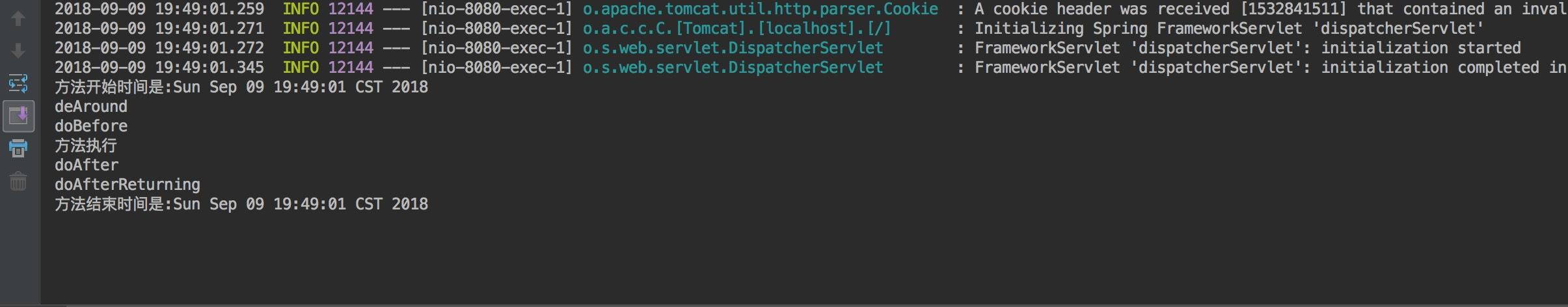 新建一个日志切面类,假设我们需要一个类来打印进入方法或方法执行后需要打印的日志。