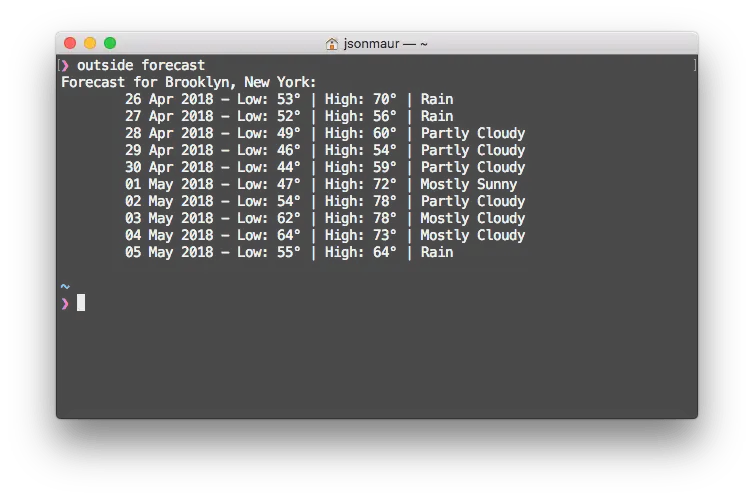 现在当你执行 outside forecast --location "Brooklyn, NY" 后,你会看到未来 10 天的天气预测结果了。接下来我们再锦上添花下,当 location 没有指定时,使用我们编写的一个工具函数来实现自动根据 IP 地址获取所处位置。