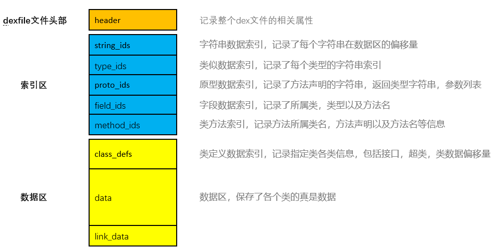 上图中的文件头部分,记录了dex文件的信息,所有字段一个分部;索引区部分,主要包含字符串、类型、方法原型、域、方法的索引;索引区最终又被存储在数据区,其中链接数据区,主要存储动态链接库,so库的信息。