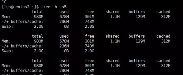 格式:free [-b|-k|-m] [-o] [-s delay] [-t] [-V]