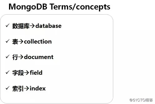 从上图可以看出,关系型数据库中的“表”,在 MongoDB 中叫做集合。“行”在 MongoDB 中叫做文档。所以我们管 MongoDB 叫做文档型数据库。