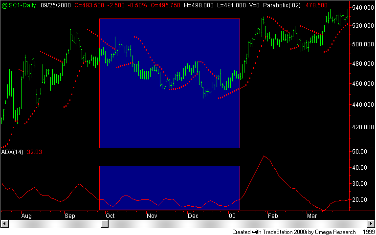 事实上许多杰出交易者也常用 ADX 来帮助他们交易;只是各家运用巧妙不同。如上图,一个运用ADX帮助滤除交易杂讯的方式,蓝色方块中因使用ADX所以这些SAR交易信号将不会被触发。