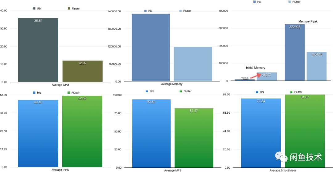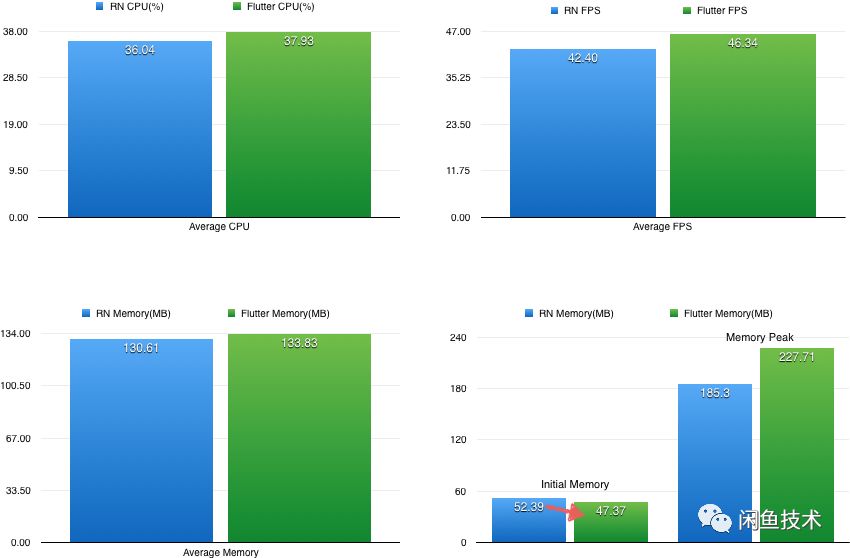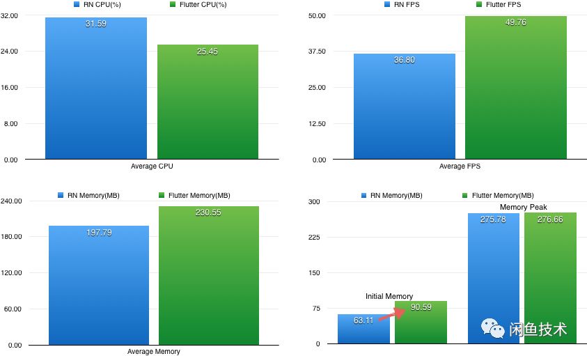 1、Flutter在低端和中端的iOS机型上,FPS的表现都优于RN 2、CPU的使用上Flutter在低端机上表现略差于RN,中端机型略优于RN 3、值得注意的是内存上的表现(上图红色箭头区域),Flutter在低端机型上的起始内存和RN几乎一致,在中端机型上会多30M左右的内存(分析为Dart VM的内存),可以想到这应该是Flutter针对低端和中端机型上内存策略是不一样的,可用内存少的机型,Dart VM的初始内存少,运行时进行分配(这样也可以理解为什么在低端机上带来了更多的CPU损耗),中端机器上预分配了更多的VM内存,这样在处理时会更加的游刃有余,减少CPU的介入,带来更流畅的体验. 可以看出,Flutter团队在针对不同机型上处理更加的细腻,目的就是为了带来稳定流畅的体验。
