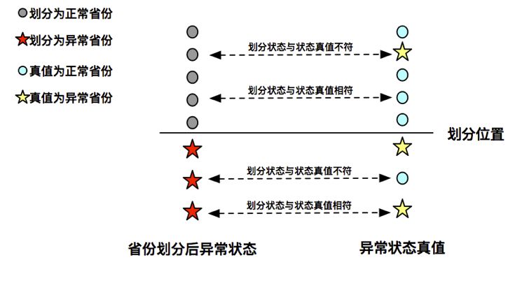 如图6示例,假设8个省份被划分,且上半部分为正常省份集合,下半部分为异常省份集合。根据异常状态真值,可计算得到划分误差为2/8=0.25。