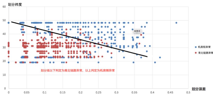 3 特征提取根据对历史数据的观察得知,南北链路异常对应的划分误差相对较小,且划分线在地图中部位置上下变化。而机房侧异常划分位置和误差没有规律可循。图7展示了两类异常数据的散点图。