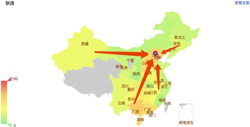 从图3(a)中可以看出,河南-山东线以南的省份,访问百度北京机房普遍出现异常率升高,而以北的省份访问北京机房异常率则较低。图3(b)中各省份访问广州机房也出现了跨南北地域访问异常、同地域访问正常的情况。