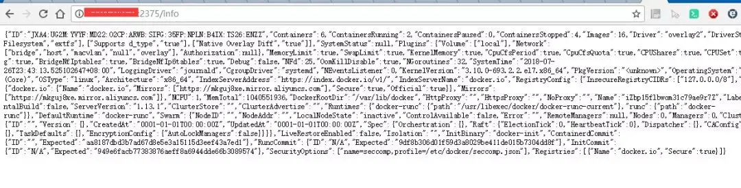 也可以直接浏览器访问:http://服务器IP:2375/info, 效果是一样的(这里隐去了阿里云服务器的地址)。