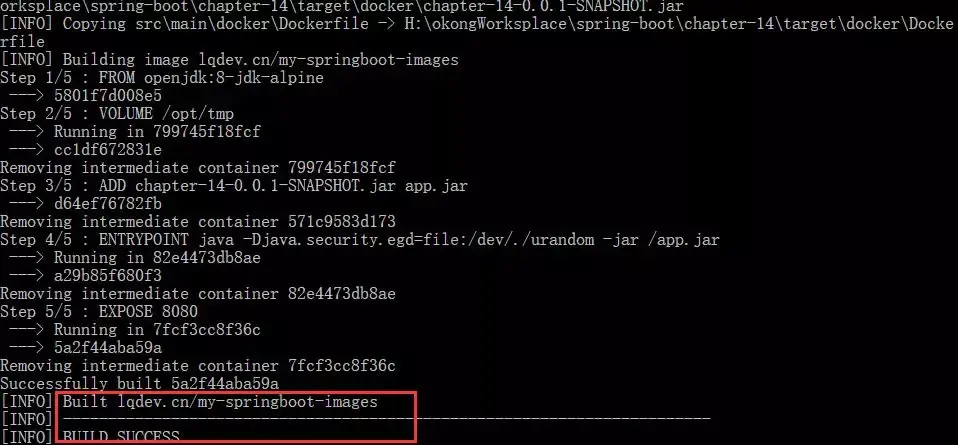 注意:这里若出现了编译异常,常见的就是500: HTTP 500 Internal Server Error了。造成这种的情况一般是镜像名称不符合命名规范:限制为字母数字 [a-zA-Z0-9],和标点符号 [.-_],及/和:(“:”一般上用来区分版本的,如lqdev.cn/demo:v1),或者Dockerfile文件未找到之类的,若出错了大家可重点看下这两个地方。