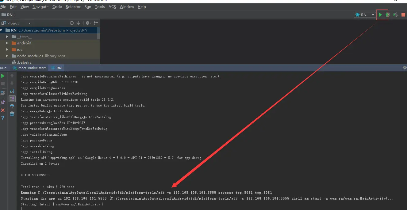 RN修改后如下图,出现可运行按钮